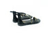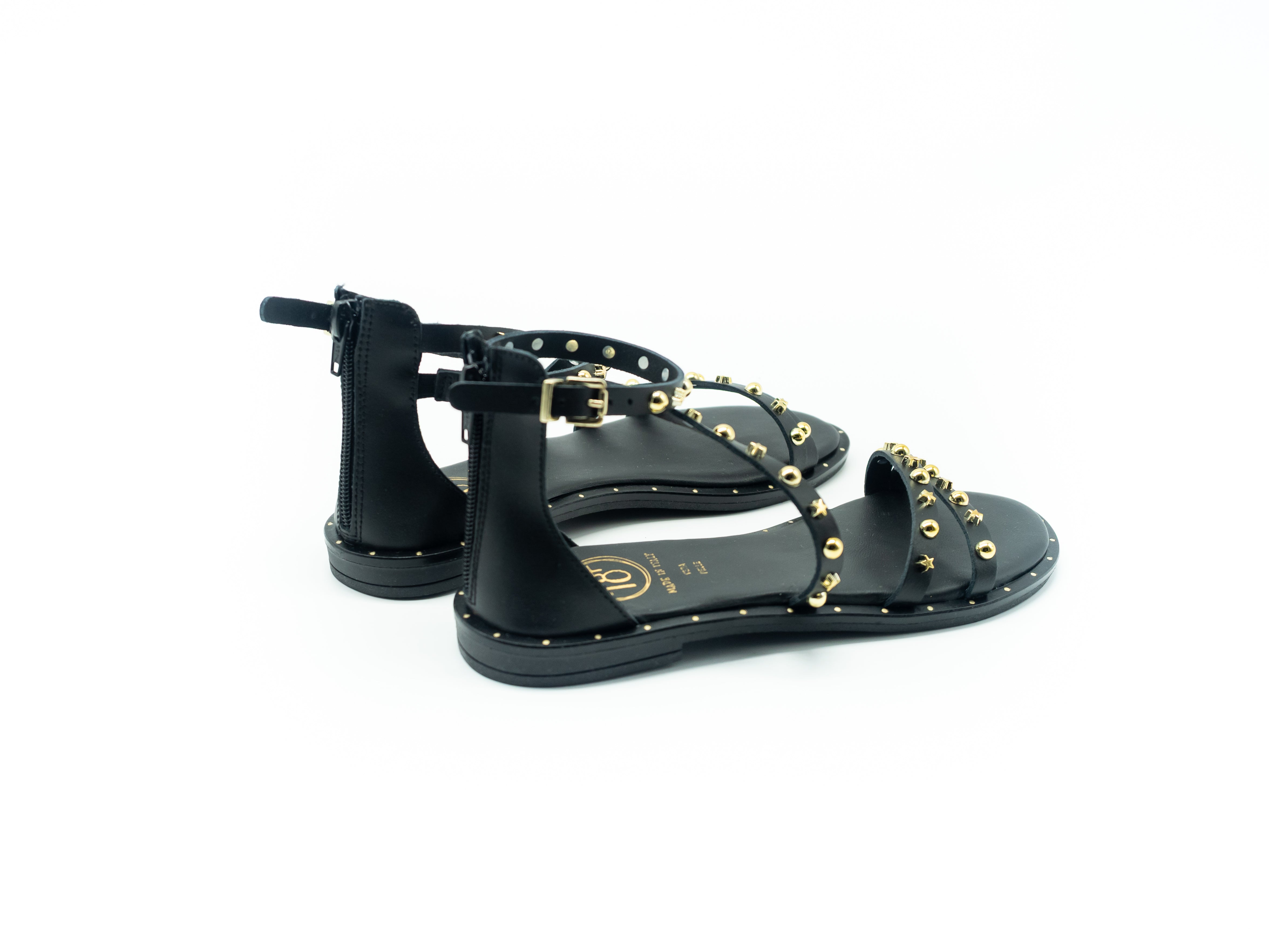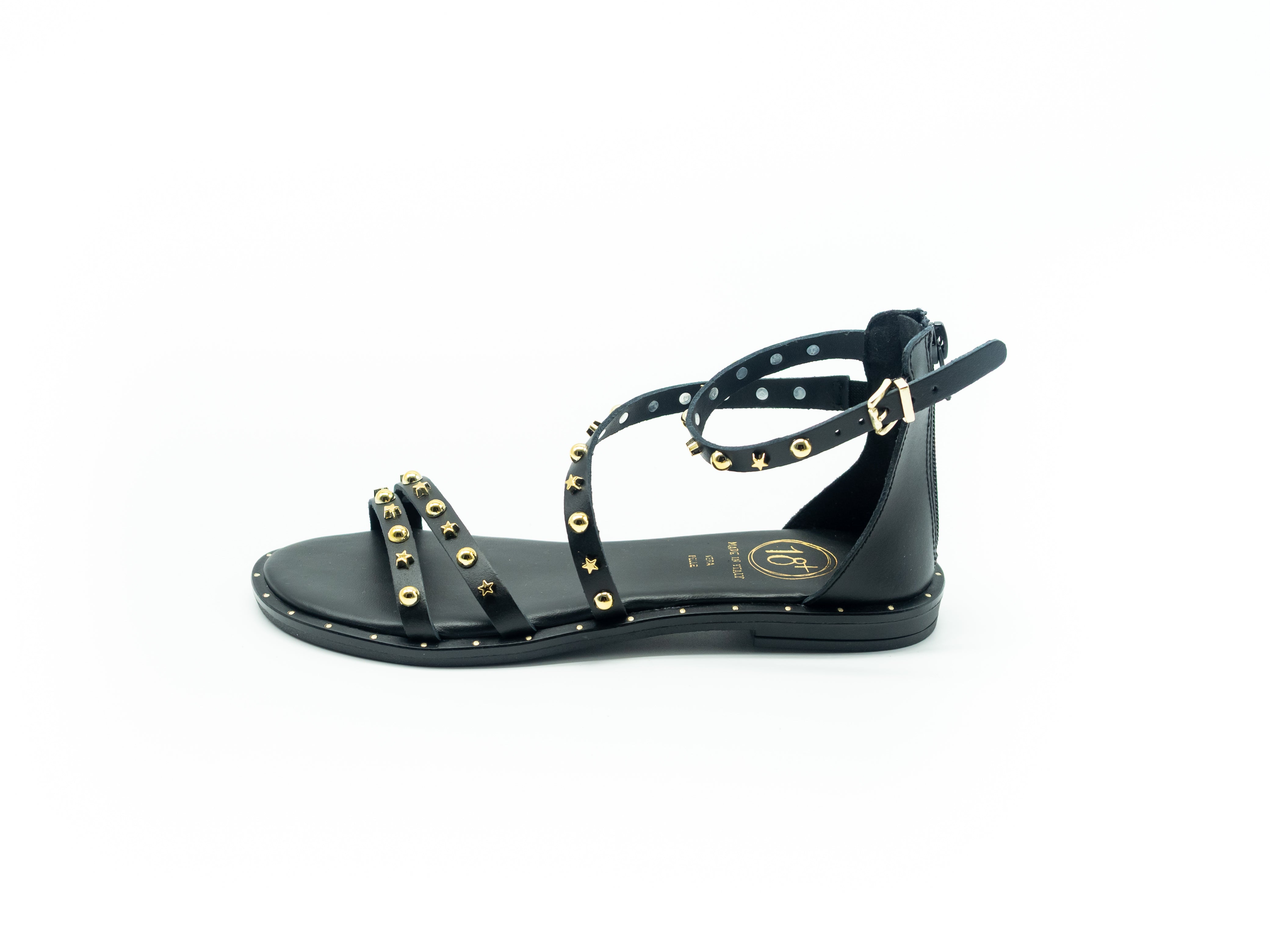 Sandalo in pelle con borchie nere e oro , plantare in pelle morbida , chiusura con cinturino alla caviglia , suola in gomma