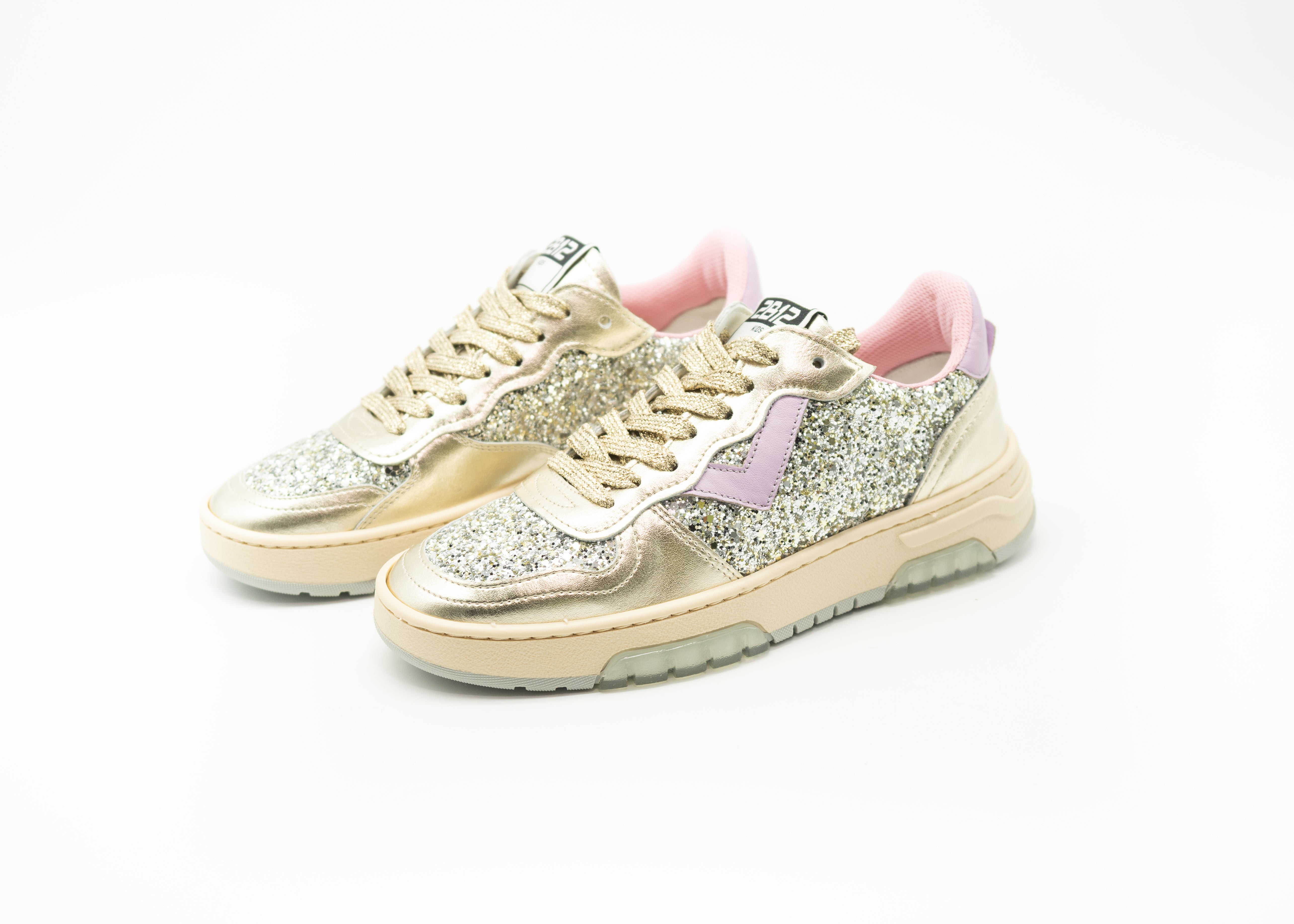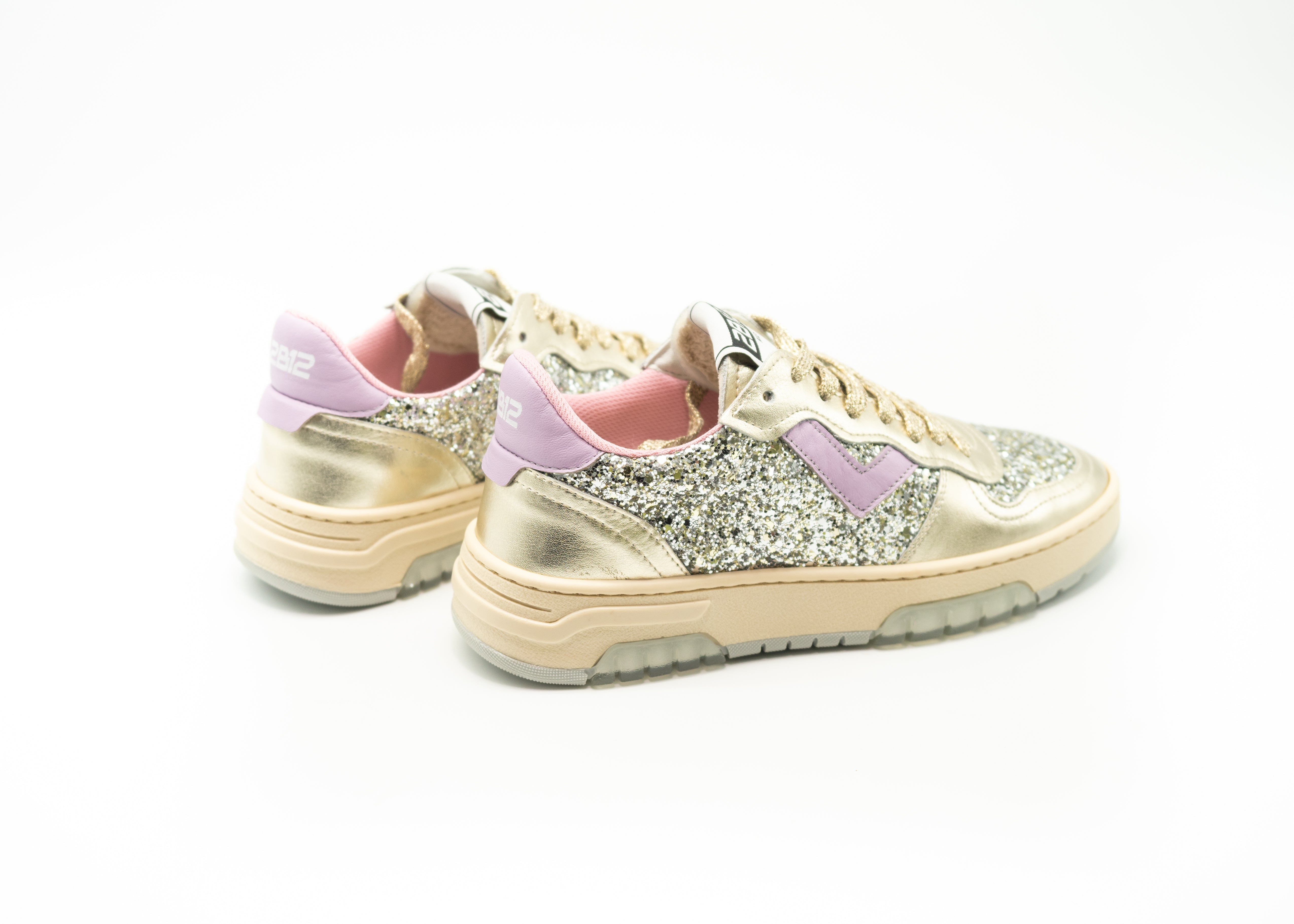 Sneakers HYPER in pelle con inserti in glitter , chiusura con laccio laminato oro , plantare in vera pelle , suola in gomma antiscivolo