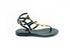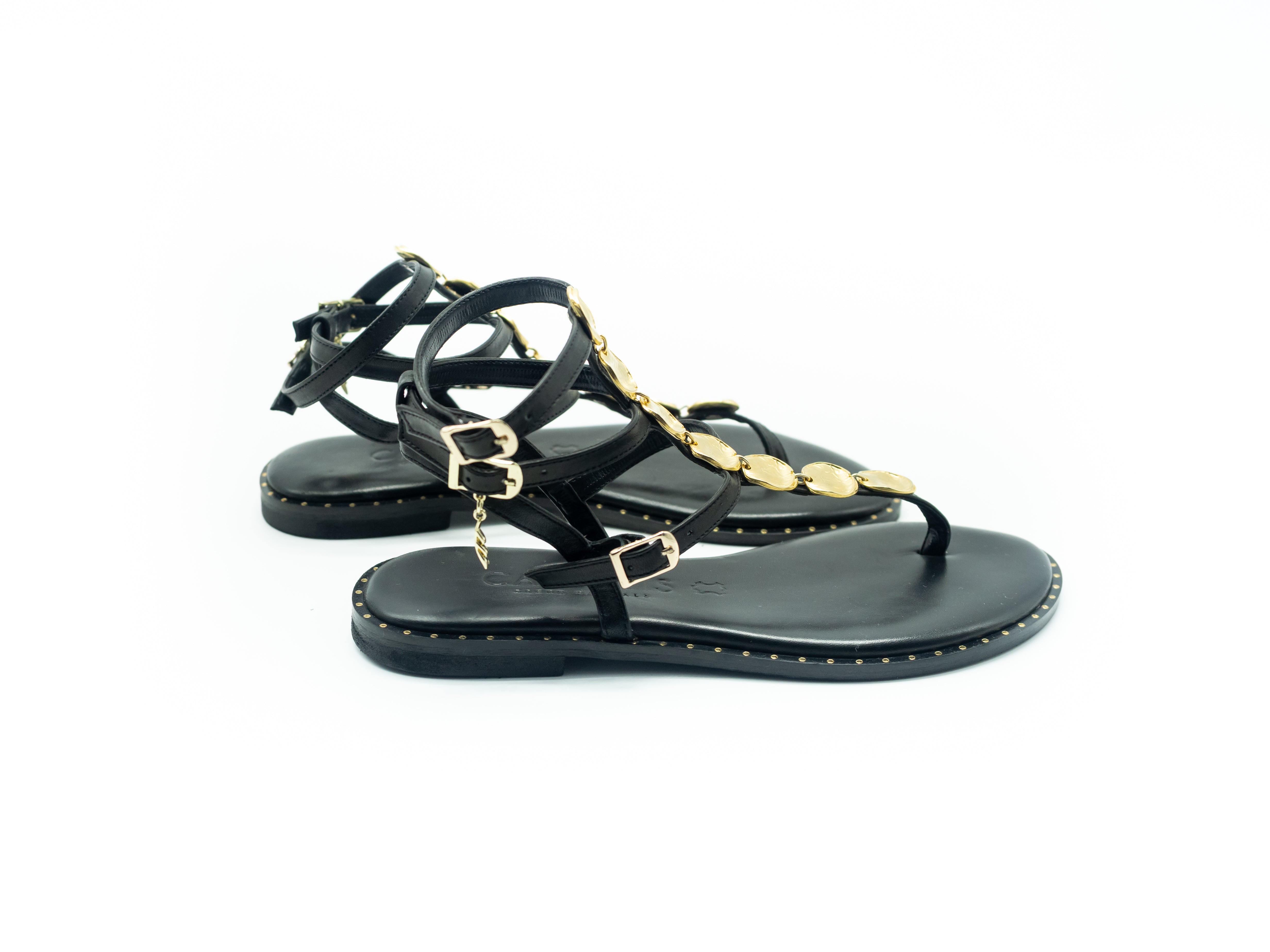 sandalo in pelle nera con accessorio oro a contrasto , plantare in pelle morbida, chiusura con fibbie , suola in gomma