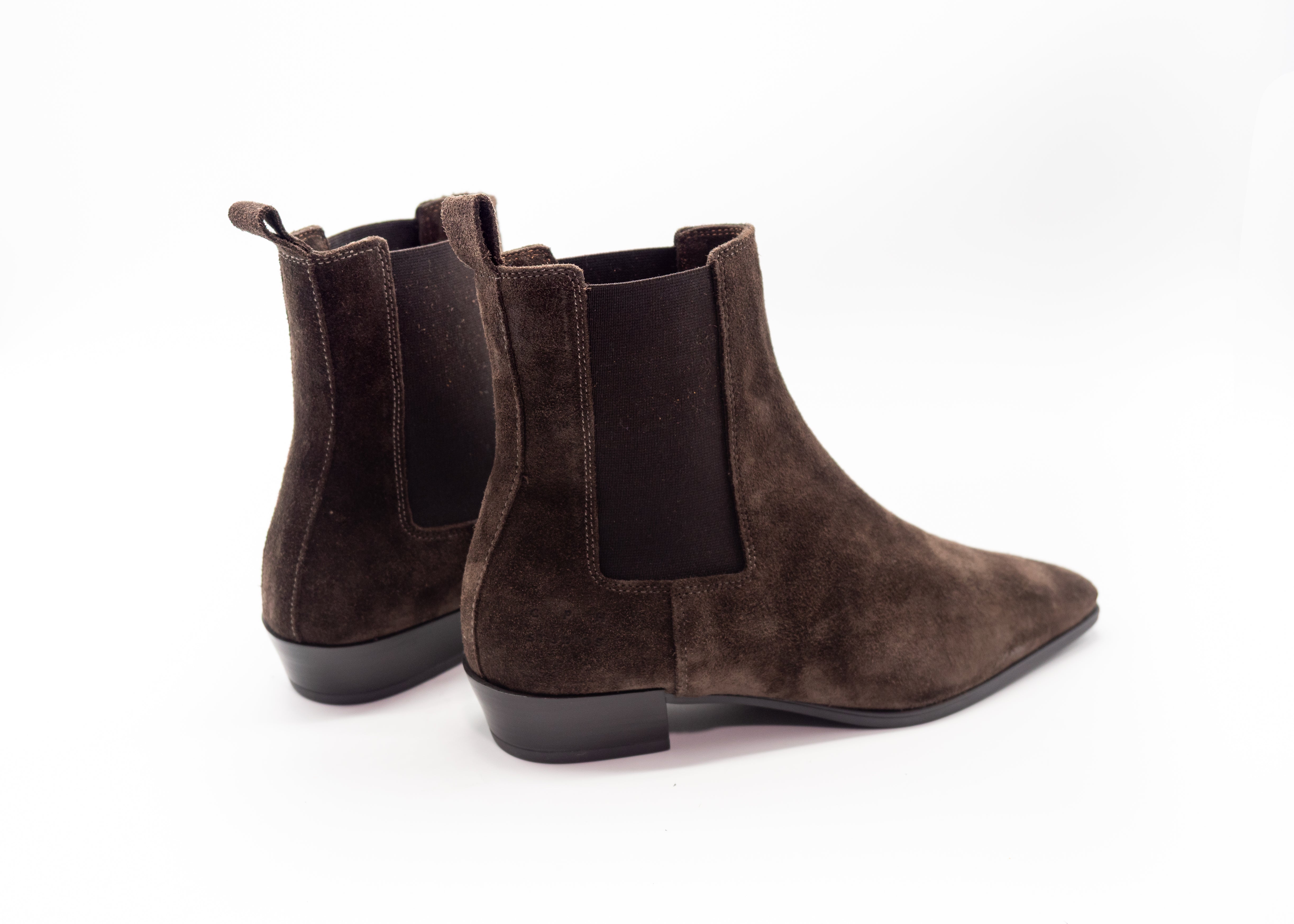 Stivaletto in pelle scamosciata color cioccolato, con silhouette stretta e un tacco sorprendente. Caldo nel tono, preciso nel taglio - una dichiarazione.