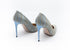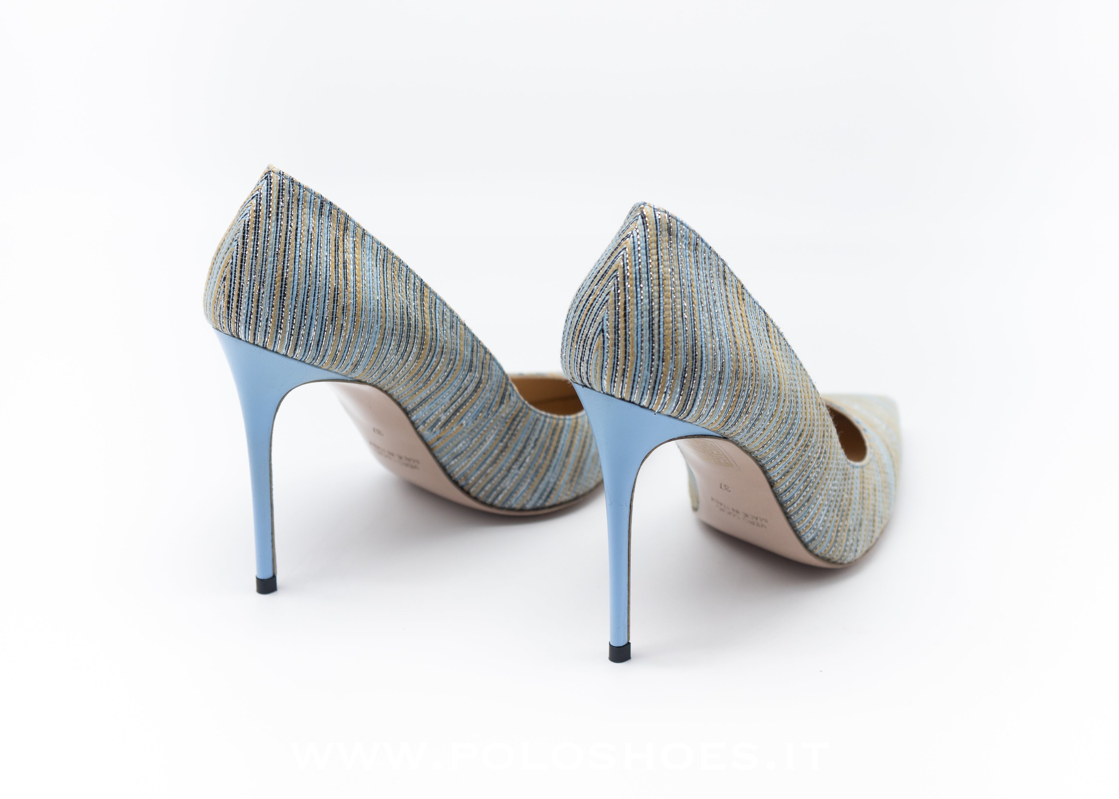 Decollete in tessuto azzurro , fodera in vera pelle , tacco 105 , suola in cuoio