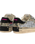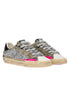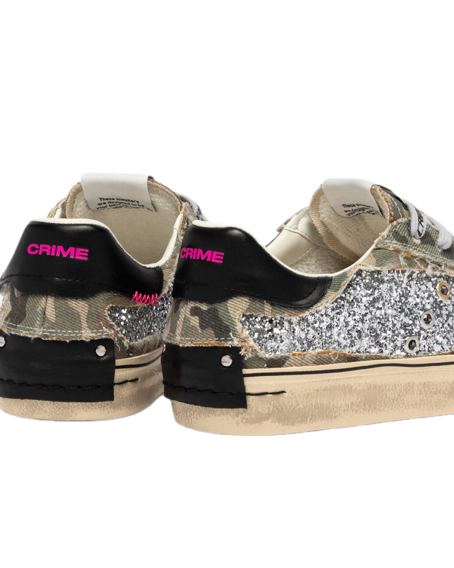 sneaker realizzata con materiali di alta qualità made in italy,tomaia in glitter canna di fucile, dettagli in suede fuxia,talloncino in pelle nera,linguetta in canvas camouflage con label logata in tessuto,patch in pelle nera sul retro,lacci grigio chiaro in cotone,fodera in pelle e tessuto,suola in ecopelle fasciata beige, alta 2.5 - 3 cm, fondo rosa,effetto vintage.