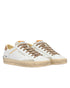sneaker realizzata con materiali di alta qualità made in italy,tomaia in pelle bianca, dettagli in suede grigio,talloncino in suede cognac,linguetta in suede sabbia con label logata in tessuto,patch in pelle bianca sul retro,doppio laccio taupe e bianco,fodera in pelle e tessuto,suola in ecopelle fasciata beige, alta miele,effetto vintage,vestibilità regular
