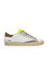 sneaker realizzata con materiali di alta qualità made in italy,tomaia in pelle bianca, dettagli in suede grigio,talloncino in suede tabacco,linguetta in pelle giallo fluo,patch in pelle bianca sul retro,doppio laccio grigio e bianco,fodera in pelle e tessuto,suola in ecopelle fasciata beige, alta 2.5 - 3 cm, fondo miele,effetto vintage,vestibilità regular