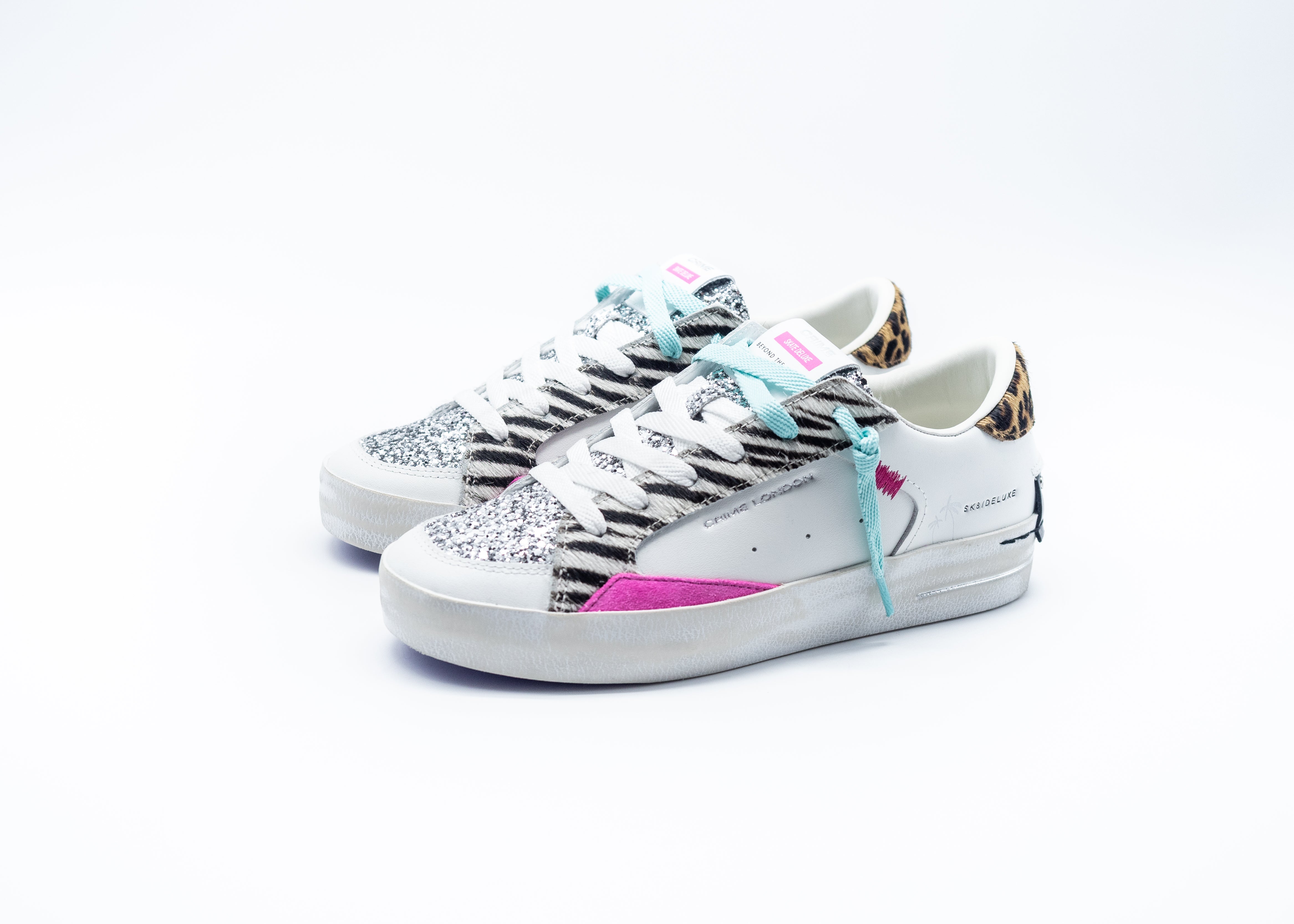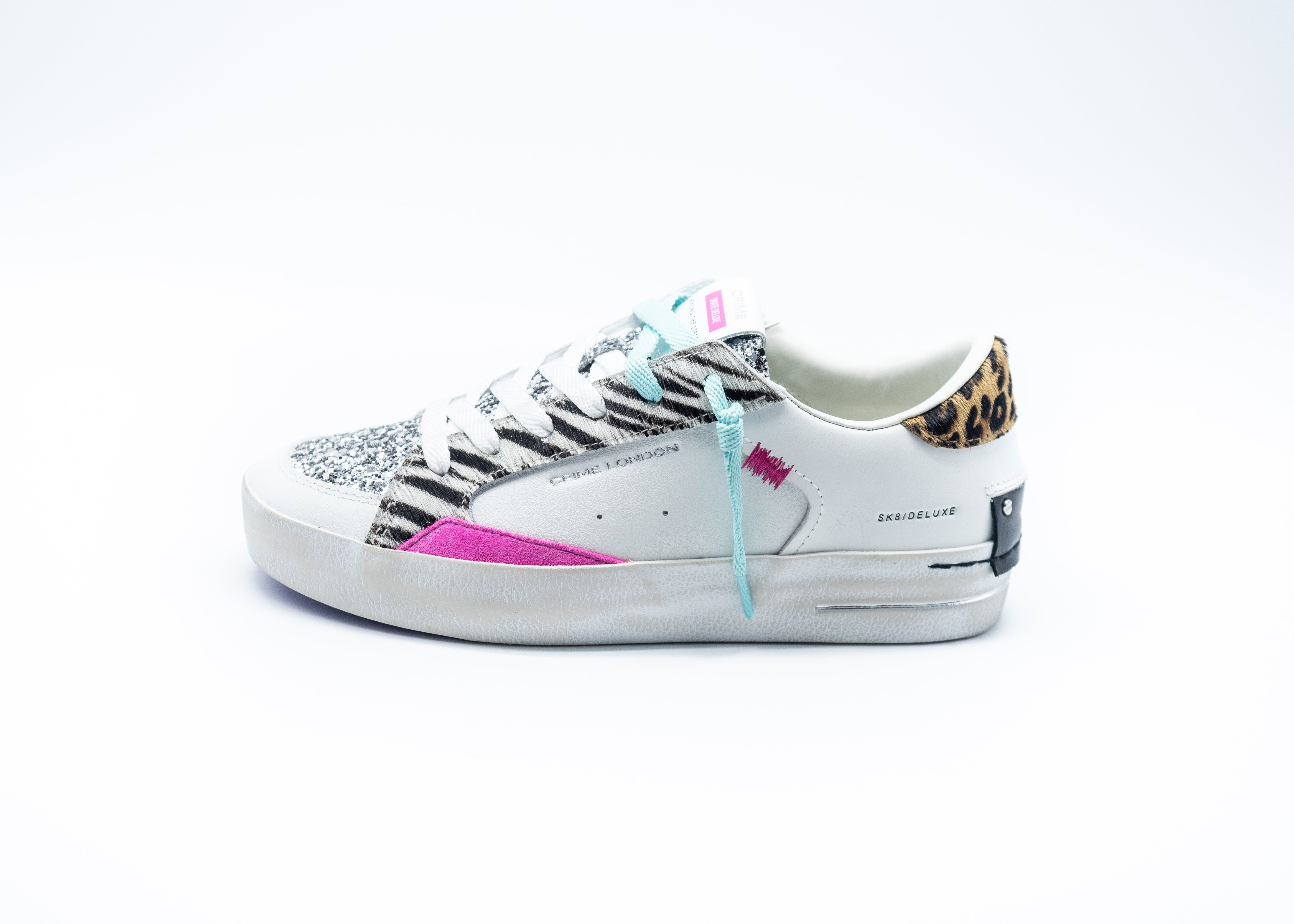 Sneaker realizzata con materiali di alta qualità Made in Italy,Tomaia in pelle bianca con cavallino zebrato, dettagli in suede fucsia,Talloncino in cavallino leopardato, Linguetta in glitter argento con label logata in pelle,Patch in pelle nera sul retro,Doppio laccio off white e verde acqua,,Fodera in pelle e tessuto,Suola in ecopelle fasciata ivory, fondo viola, alta 2.5 - 3.5 cm,Vestibilità regular
