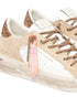 sneaker realizzata con materiali di alta qualità made in italy,tomaia in pelle e suede bianca e taupe, dettagli in pelle bianca,talloncino in glitter oro,linguetta in pelle bianca con label logata in pelle,patch in pelle bianca sul retro,doppio laccio con strass e bianco,fodera in pelle e tessuto,suola in ecopelle fasciata panna, alta 2.5 - 3 cm, fondo sabbia,effetto vintage,vestibilità regular