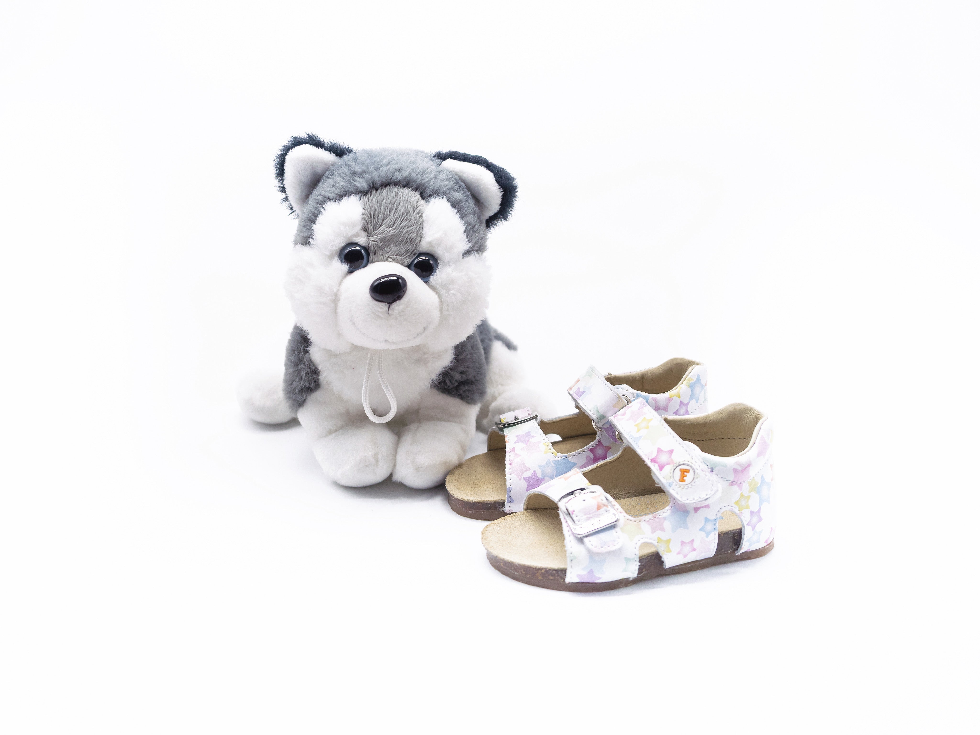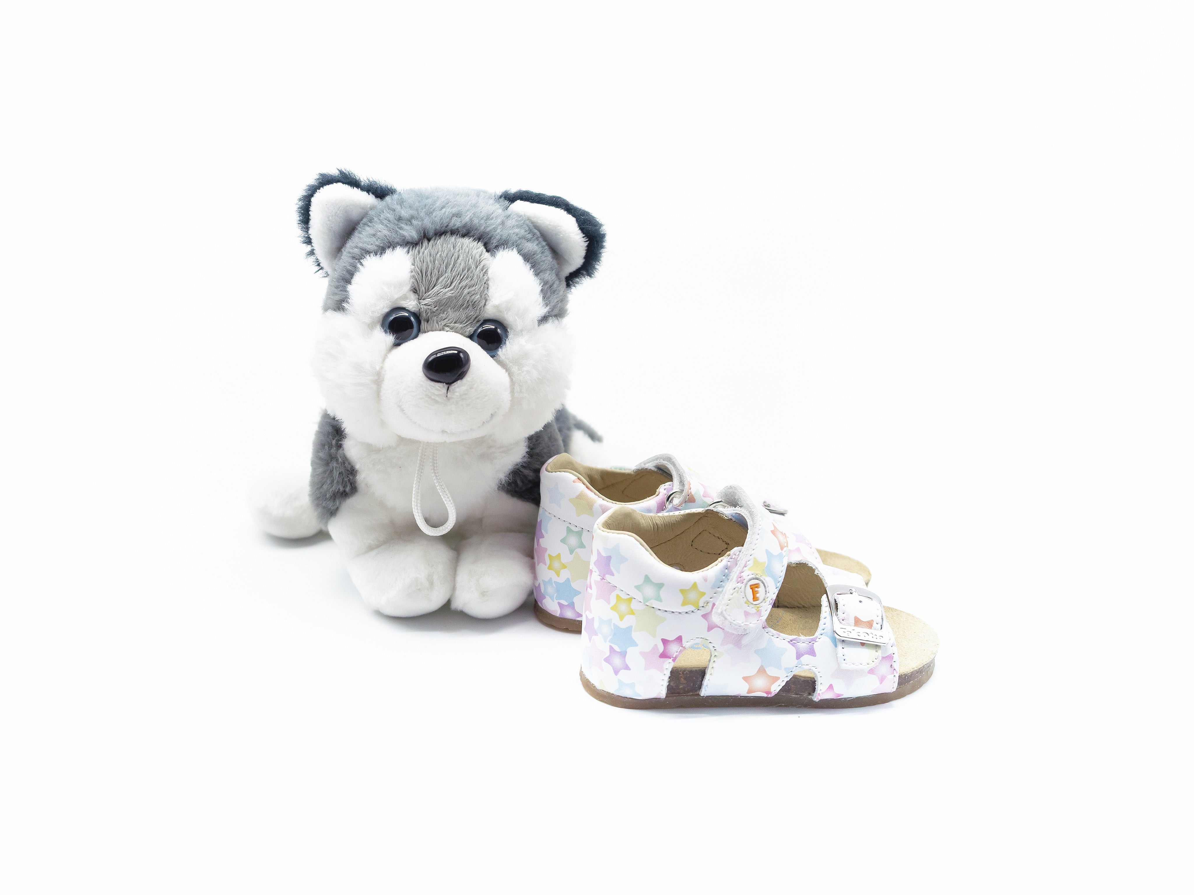 Sandalo con doppia chiusura con fibbia e strappo rendono la calzata regolabile su ogni tipo di piedino, il tallone strutturato facilita la stabilità dei primi passi, e la stampa fantasia dona uno speciale look magico. Fodera interna in pelle e suola in gomma con fondo antiscivolo.