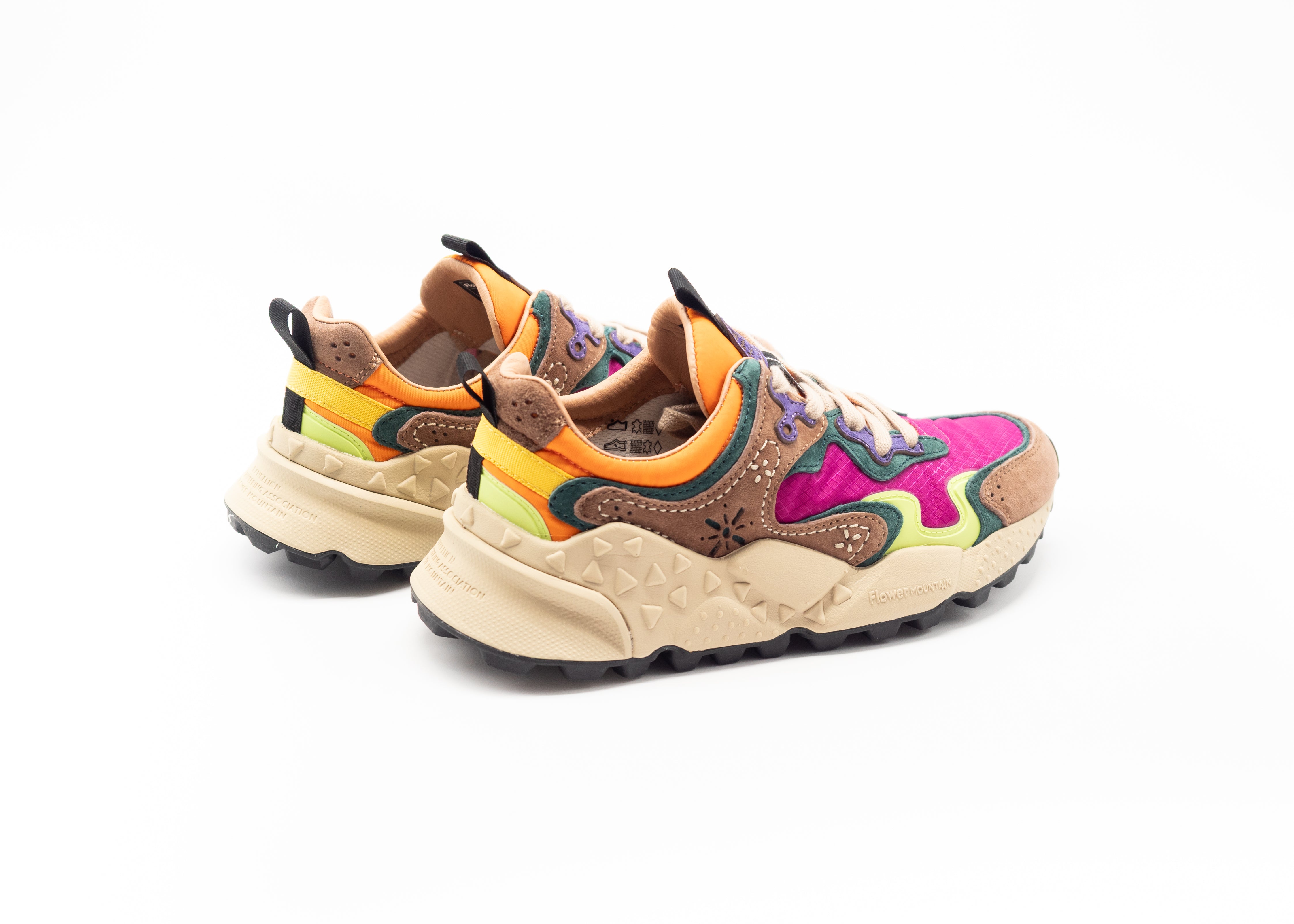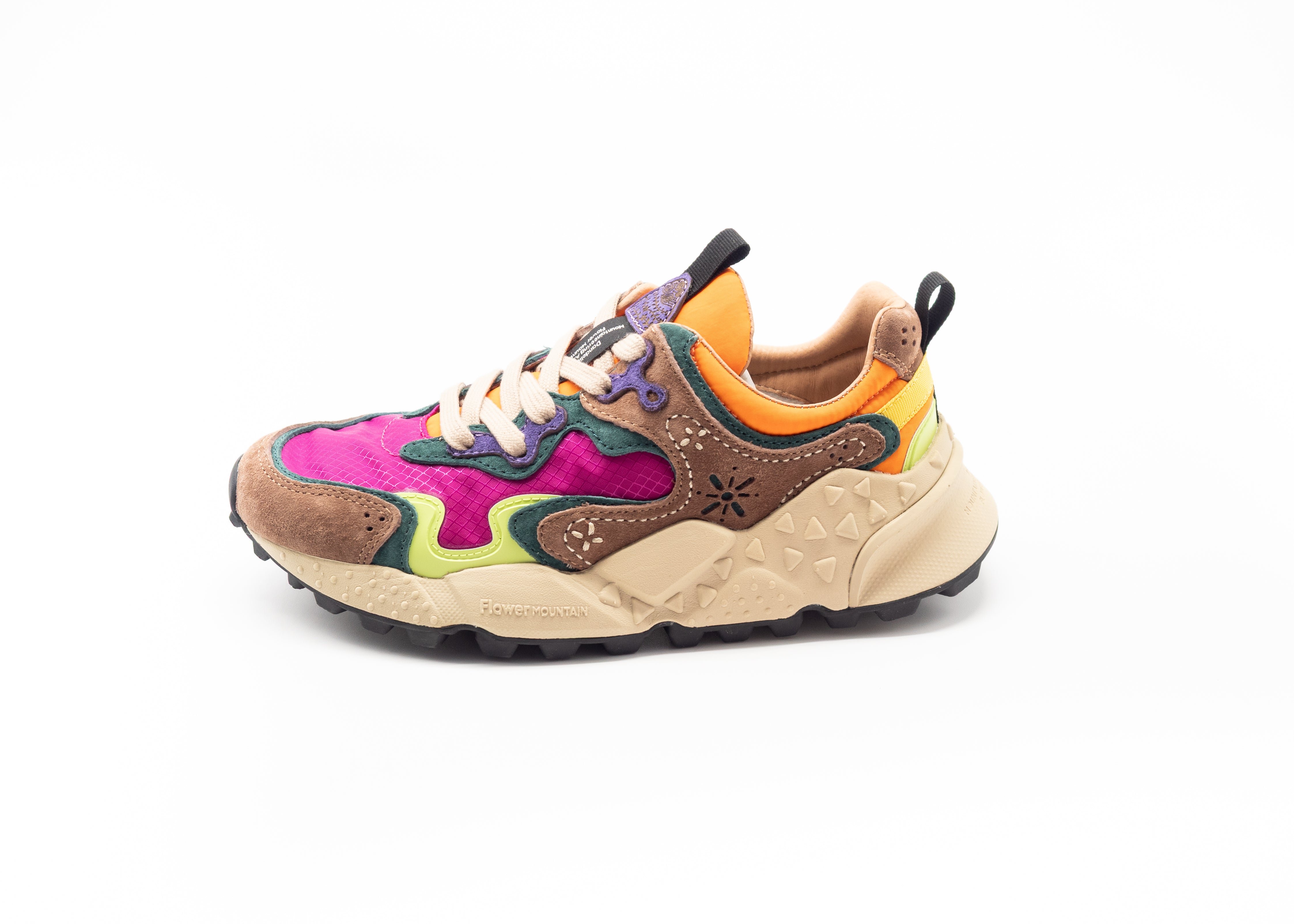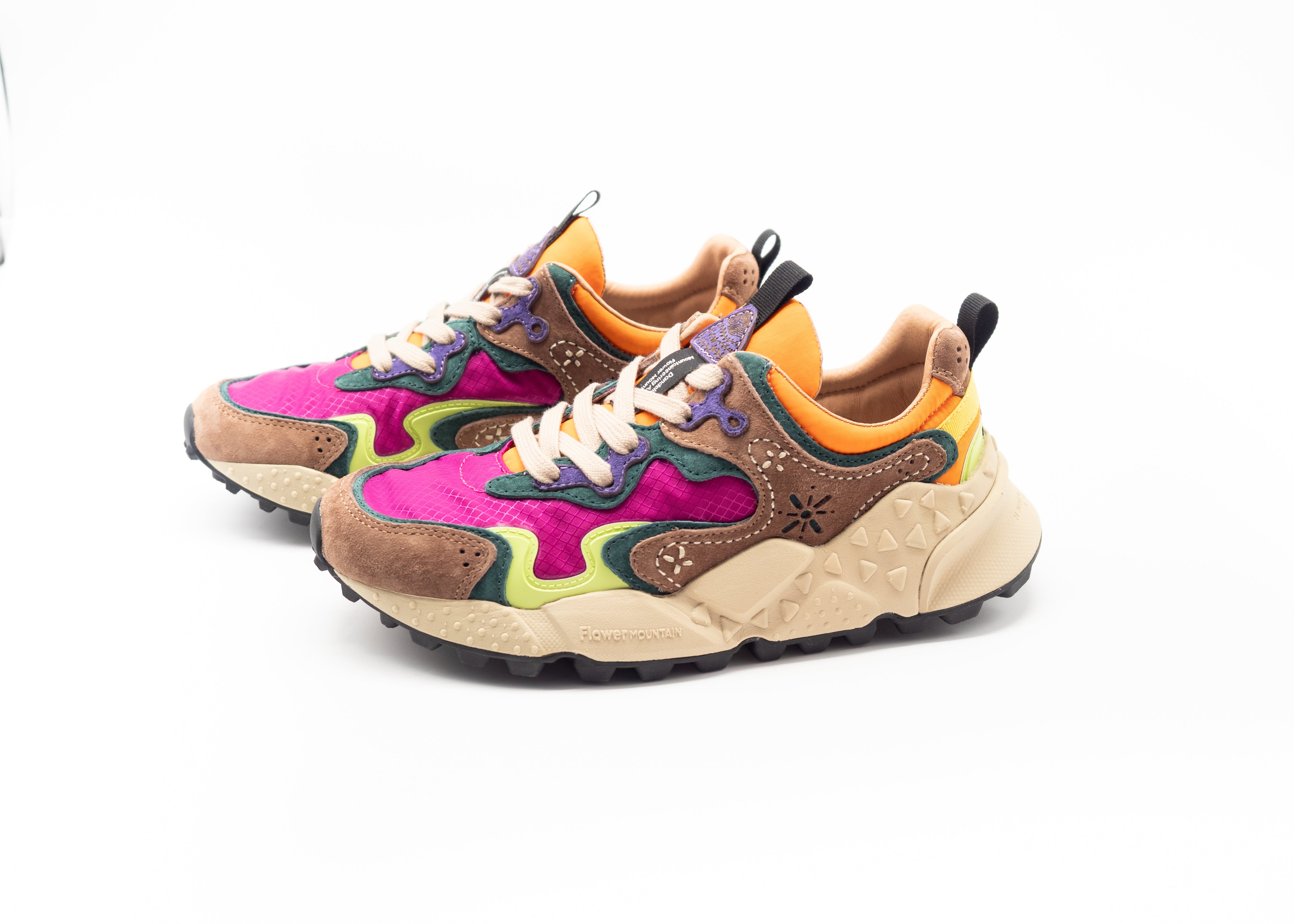 Sneaker sportiva in tessuto tecnico e suede multicolore. Chiusura con lacci in cotone, fodera in pelle e soletta in sughero naturale antibatterico. Fondo in gomma ultra leggera con sagomature laterali e battistrada dentellato.
