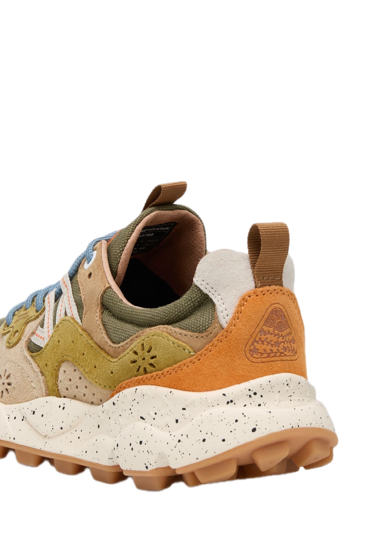 Le sneaker Yamano mixano dettagli active con un'estetica cool, perfetta anche in città. La tomaia in tessuto tecnico e pelle presenta dettagli in suede con la caratteristica costruzione overlapping, stringhe trekking e occhiello dalla sagomatura floreale. La suola è in gomma ultra leggera, con sagomature laterali e battistrada dentellato. La soletta interna in sughero naturale antibatterico assicura benessere al piede e comfort all day long.