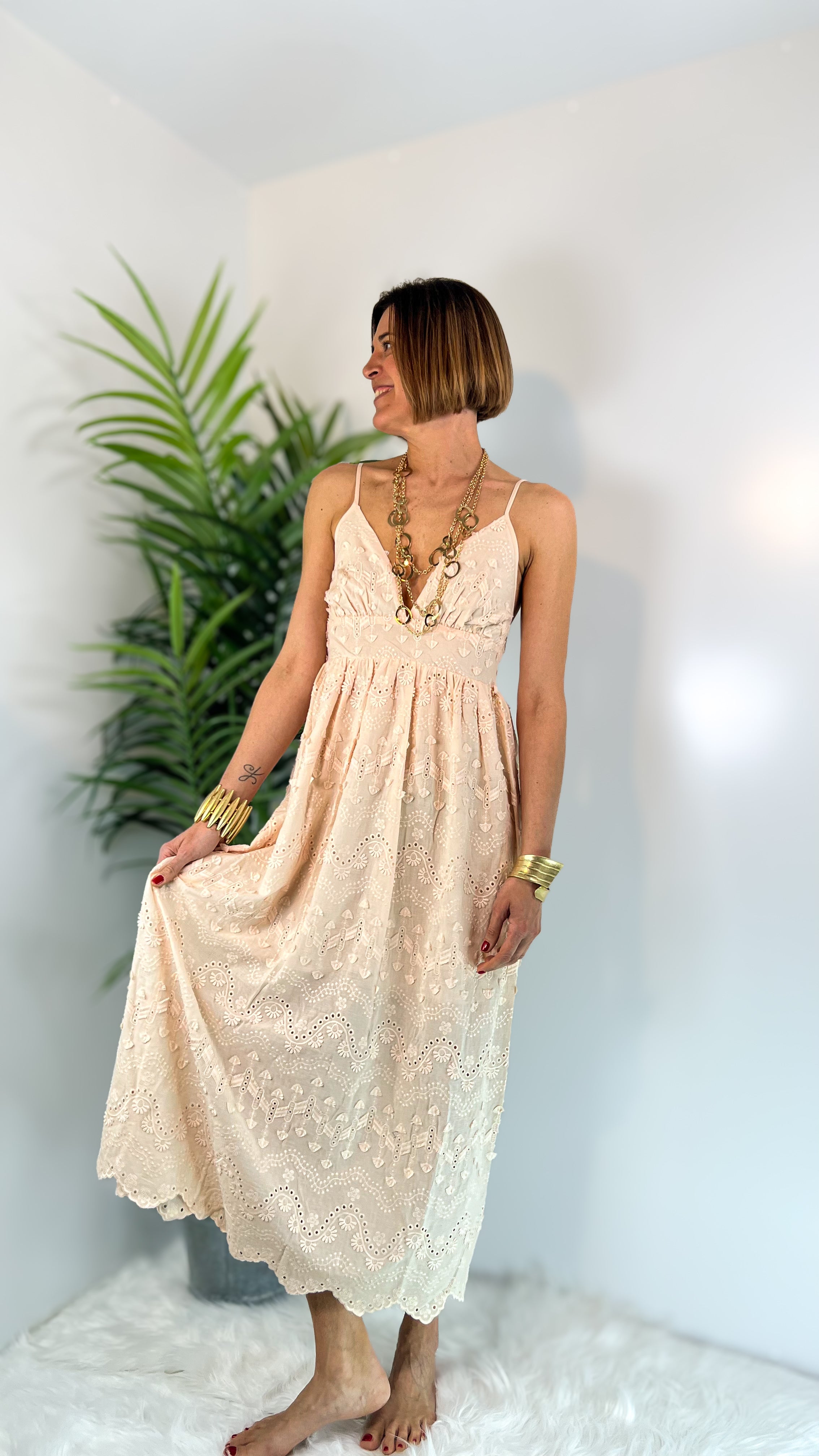 Abito lungo realizzato in tessuto ricamato COTONE sangallo,scollo a V profondo con spalline sottili regolabili, taglio sotto il seno per una vestibilità femminile, orlo con bordi smerlati, tessuto cotone leggero e traspirante
