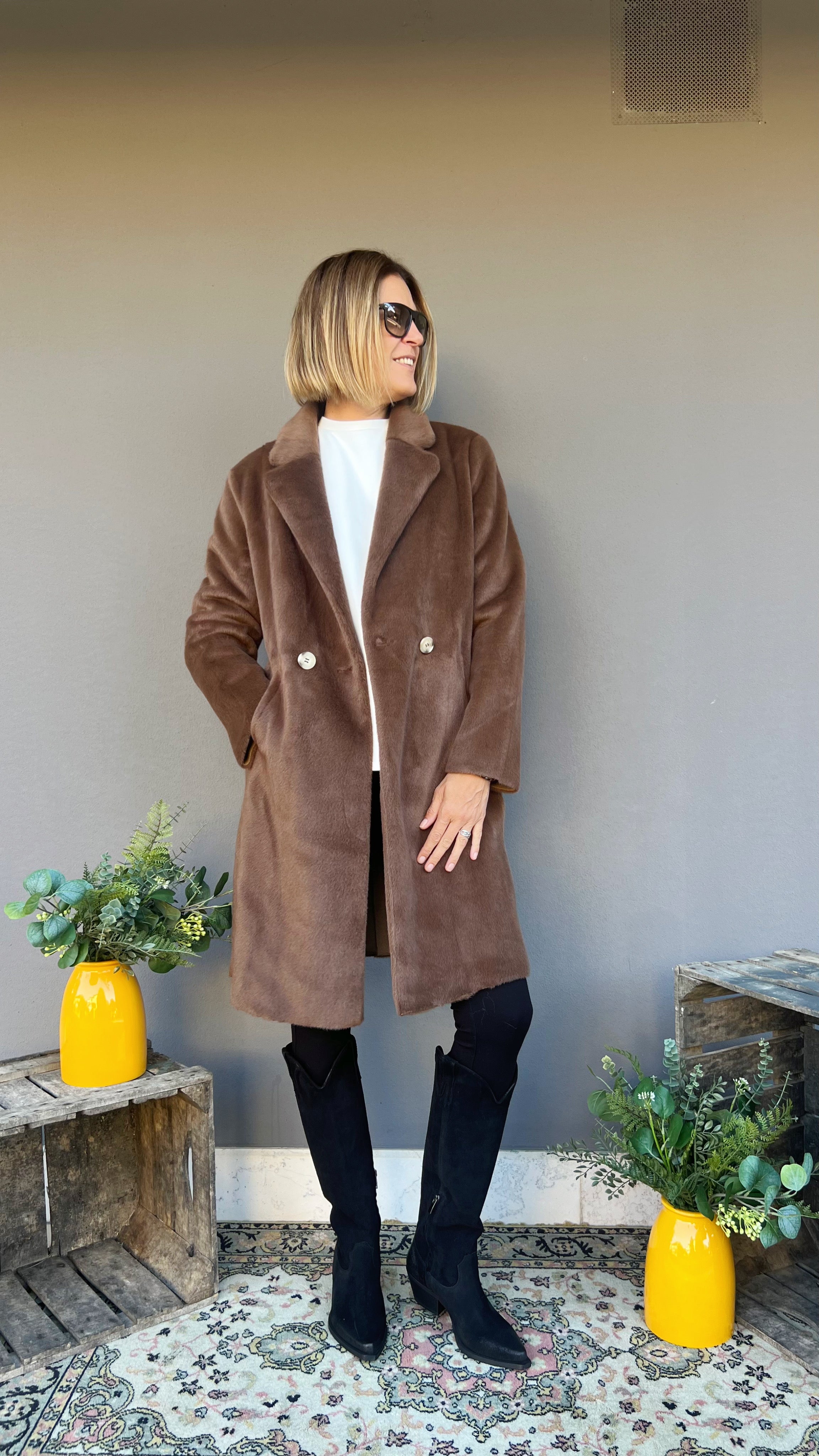 cappotto in pelliccia sintetica dal tocco morbido, doppiopetto con chiusura a bottoni, colletto con ampi revers per uno stile elegante, tasche laterali ,taglio dritto e struttura leggera