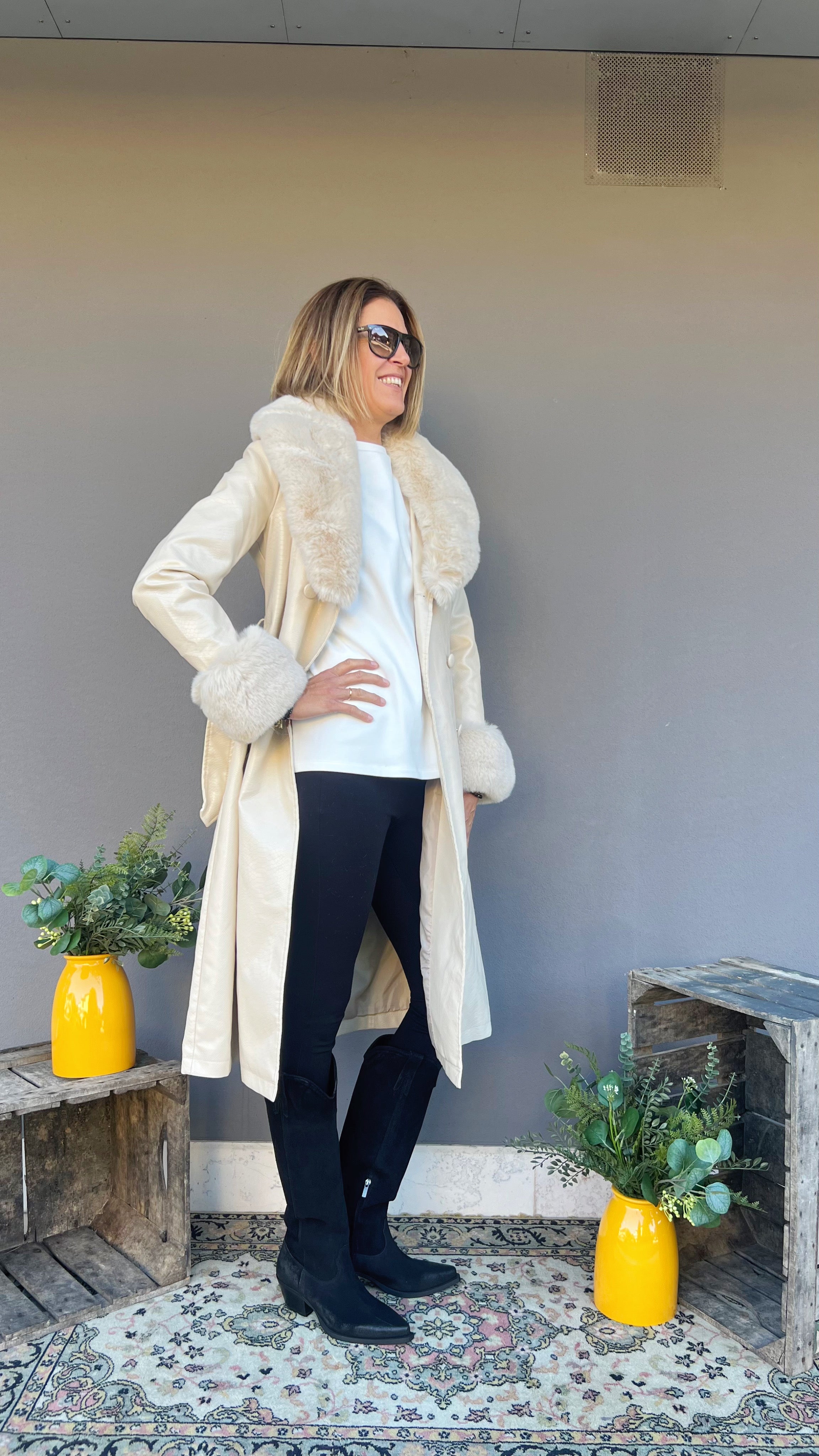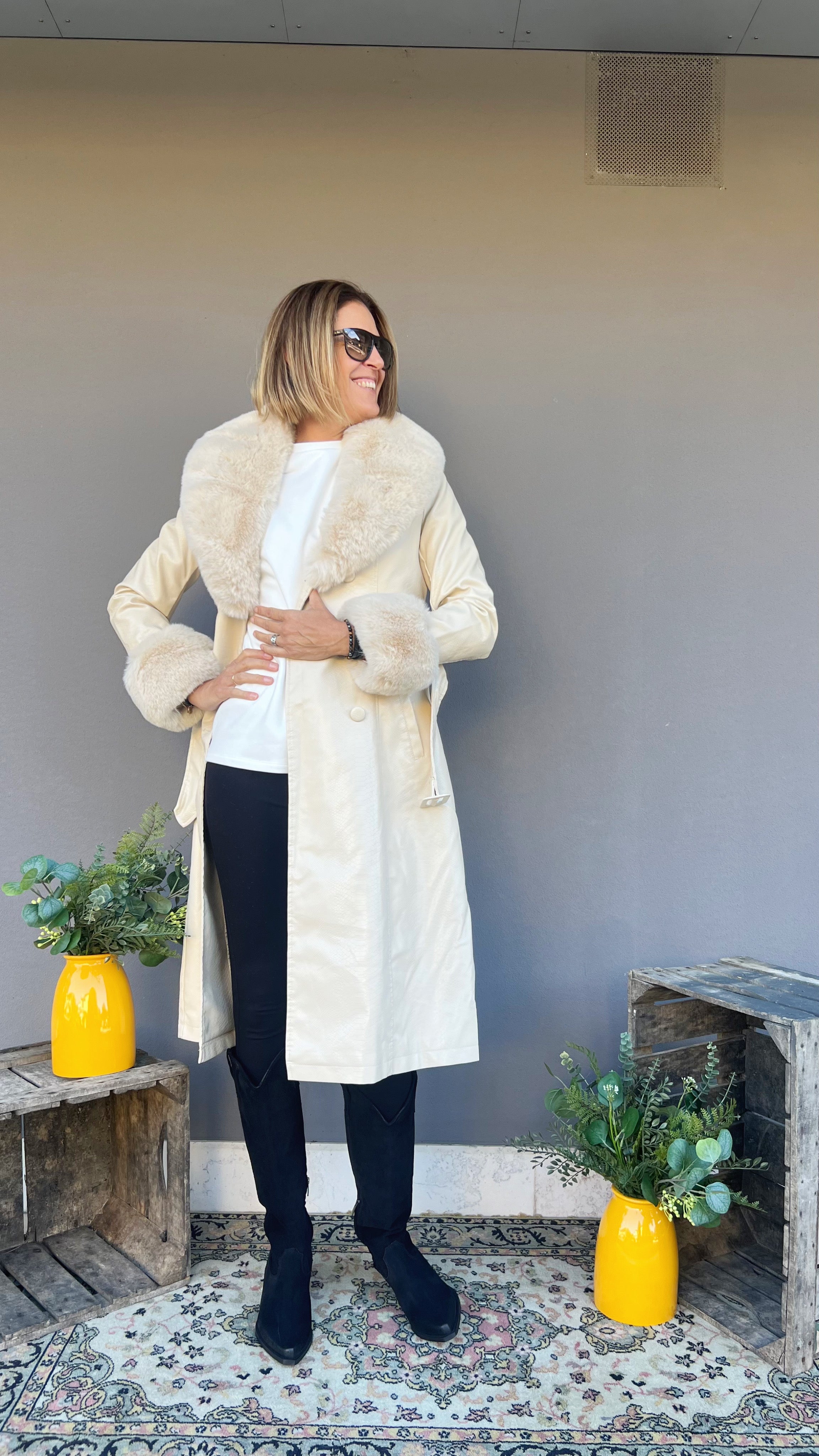 Trench in pelle ecologica texturizzata con collo e maniche in pelliccia RIMOVIBILI