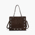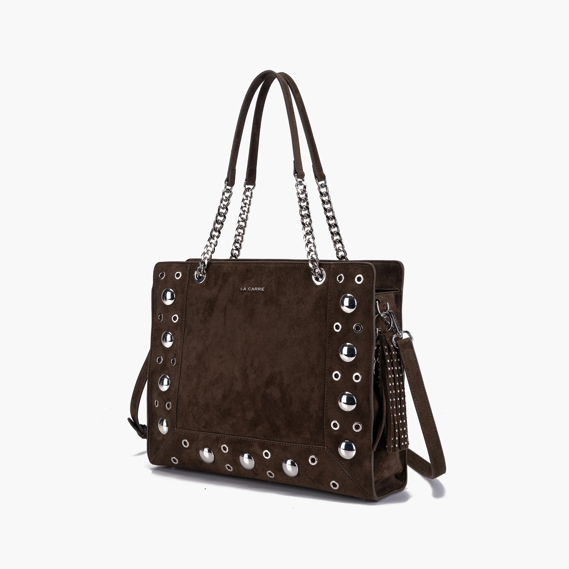Borsa shopping in suede con occhielli e borchie in argento, doppi manici in catena e tracolla rimovibile