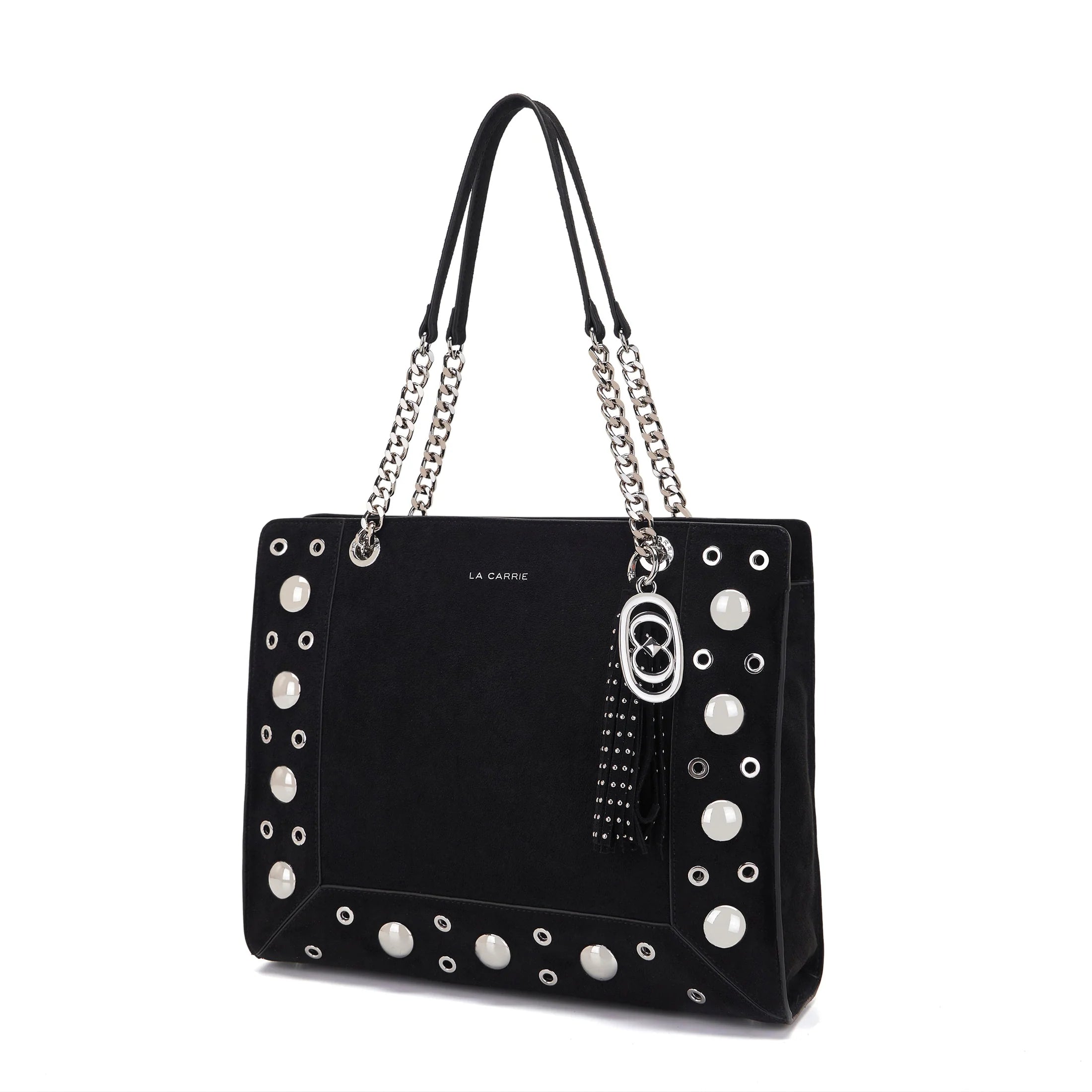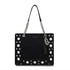 Borsa shopping in suede con occhielli e borchie in argento, doppi manici in catena e tracolla rimovibile