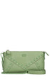 portafoglio in pelle martellata con borchie in tinta applicate lungo le spezzature, chiusura a zip e tracolla rimovibile.