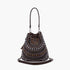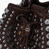 Secchiello in ecopelle martellata con applicazioni di borchie e pietre dure con cabochon; manico e tracolla rimovibili