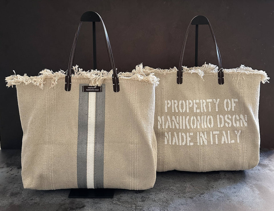 n°2 project e' la shopper in cotone tessuto a grana grezza , manici in cuoio con luce 22cm perfetti per una portabilita' anche a spalla . etichetta property-manikomio dsgn in cuoio e grande scritta property manikomio dsgn made in italy serigrafata sul retro della shopper, banda colorata che ,serigrafata verticalmente a mano sul fronte ,all'interno abbiamo inserito una maxi pochette 33x17x10 cm in tessuto . maxi pochette per dare una estrema sicurezza al contenuto della tua shopper e che potra' anche essere utilizzata anche da sola ...