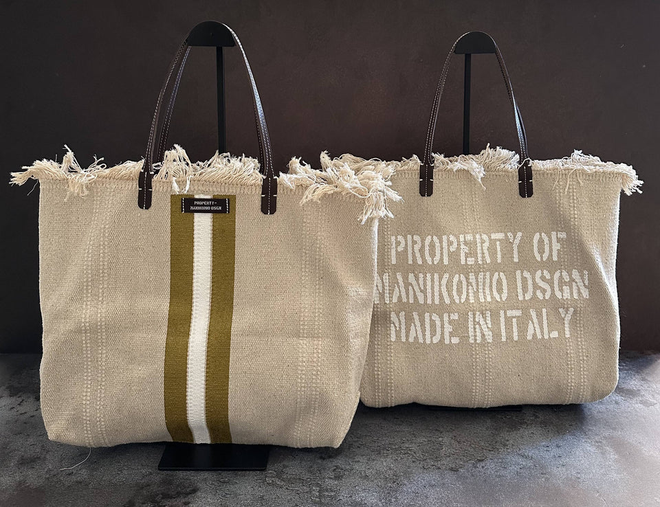 n°2 project e' la shopper in cotone tessuto a grana grezza , manici in cuoio con luce 22cm perfetti per una portabilita' anche a spalla . etichetta property-manikomio dsgn in cuoio e grande scritta property manikomio dsgn made in italy serigrafata sul retro della shopper, banda colorata che ,serigrafata verticalmente a mano sul fronte ,all'interno abbiamo inserito una maxi pochette 33x17x10 cm in tessuto . maxi pochette per dare una estrema sicurezza al contenuto della tua shopper e che potra' anche essere utilizzata anche da sola ...