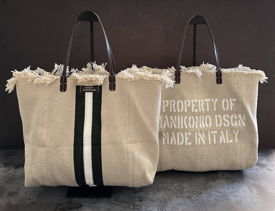 n°2 project e' la shopper in cotone tessuto a grana grezza , manici in cuoio con luce 22cm perfetti per una portabilita' anche a spalla . etichetta property-manikomio dsgn in cuoio e grande scritta property manikomio dsgn made in italy serigrafata sul retro della shopper, banda colorata che ,serigrafata verticalmente a mano sul fronte ,all'interno abbiamo inserito una maxi pochette 33x17x10 cm in tessuto . maxi pochette per dare una estrema sicurezza al contenuto della tua shopper e che potra' anche essere utilizzata anche da sola ...