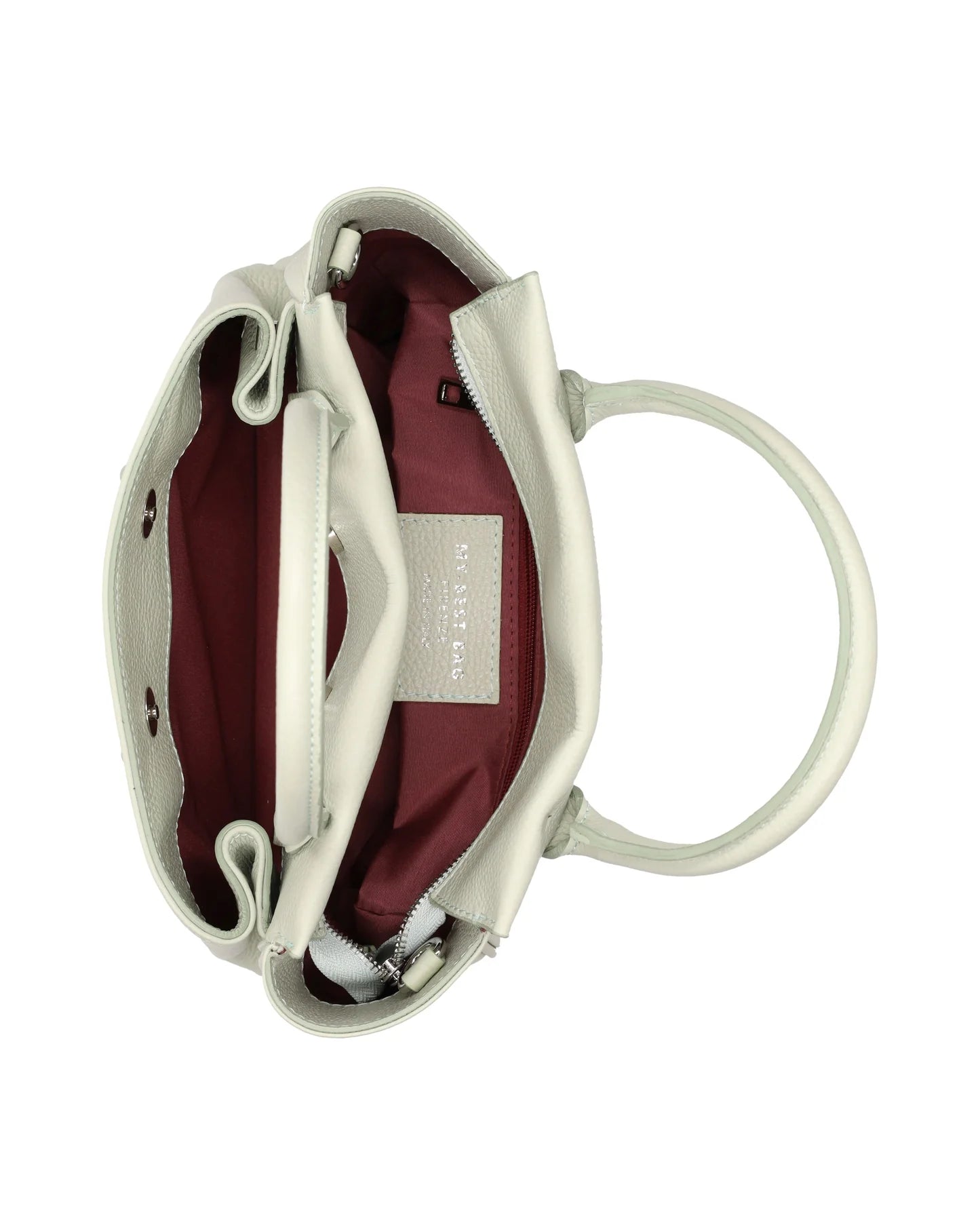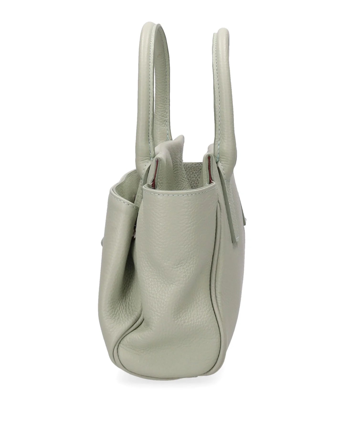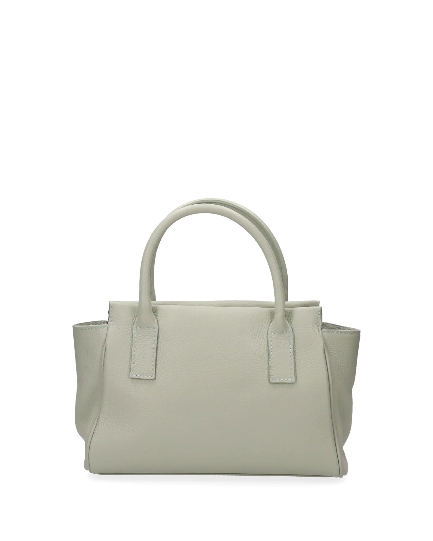 Handbag realizzata in pelle dollaro, resistente e morbida al tatto, è dotata di chiusura con zip. Sul fronte è presente una pratica tasca con chiusura magnetica, impreziosita da una placca metallica che riprende il colore della borsa, diventando un dettaglio distintivo che valorizza il design.