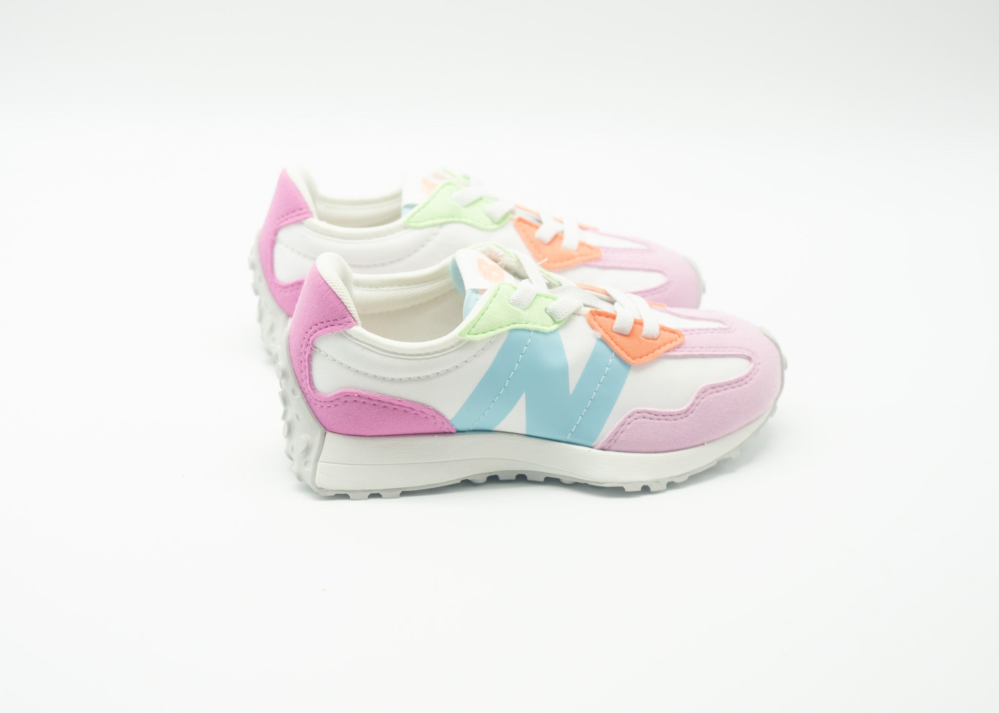 Con una rivisitazione angolare dell’amata silhouette a zeppa, con il marchio “N” sovradimensionato applicato asimmetricamente e un’avvolgente suola dentellata ispirata al trail, le 327 assicurano una reiterazione del running della tradizione. Le 327 per bambini miniaturizzano questo modello classico adattandolo ai piedi in crescita. Chiusura con laccio in elastico
