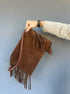 Pochette in pelle camoscio frangiata , chiusura con zip , tracolla in pelle regolabile e rimovibile , manico in pelle rimovibile