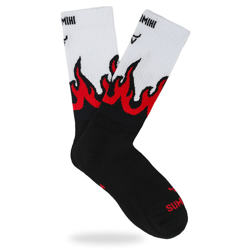 Calzini SUMOMIHI, media lunghezza in morbido cotone. Bicolore nero e bianco. Fiamme rosse e nere in tessitura Jacquard.