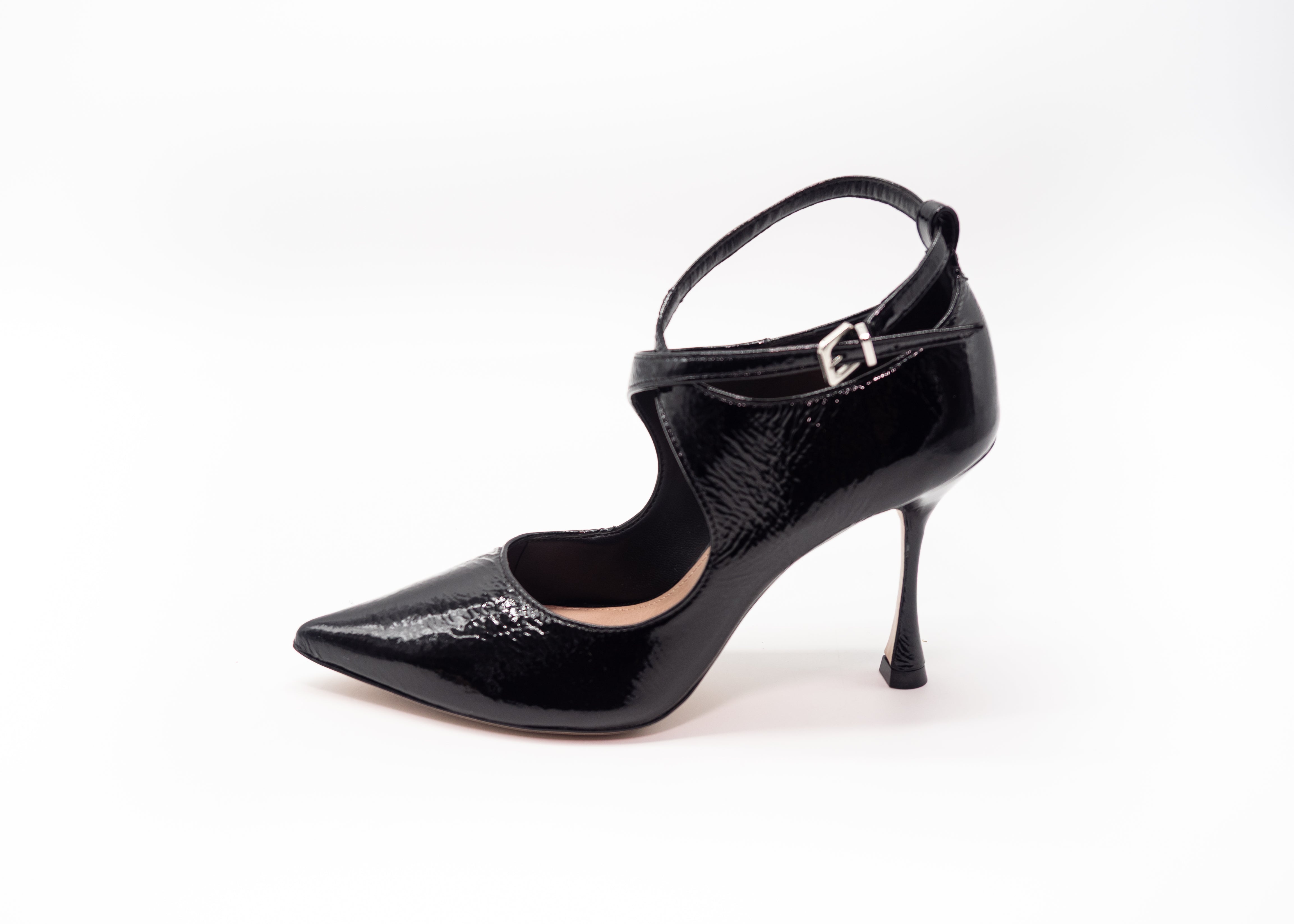 Scarpa in pelle naplack morbida verniciata nera , regolazione alla caviglia con cinturino, tacco rivestito 9cm , suola in vero cuoio